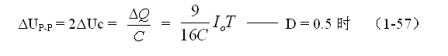 (1-58)和(1-59)式,就是計算并聯(lián)開關(guān)電源儲能濾波電容的公式(D = 0.5時)。式中:Io是流過負載電流的平均值,T為開關(guān)工作周期,ΔUP-P為濾波輸出電壓的波紋,或電壓紋波。一般波紋電壓都是取電壓增量的峰-峰值,因此,當(dāng)D = 0.5時,波紋電壓等于電容器充電的電壓增量,即:ΔUP-P = 2ΔUc 。