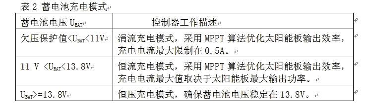 當(dāng)系統(tǒng)檢測到環(huán)境光充足,控制器就會進(jìn)入充電模式。蓄電池充電有兩個比較重要的電壓值:深度放電電壓和浮充充電電壓。前者代表在正常使用情況下蓄電池電能被用完的狀態(tài), 而后者則代表蓄電池充電的最高限制電壓,這些參數(shù)應(yīng)該從蓄電池產(chǎn)品手冊上可以查到。在設(shè)計電路中針對12V蓄電池,分別設(shè)置深度放電電壓為11V和浮充充電電壓為13.8V(皆為在室溫條件下的電壓值,軟件中這兩個值增加了相應(yīng)的溫度補償),具體充電模式如表2所示。