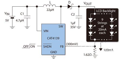 首先計算處理2W的負(fù)載需要多大的開關(guān)電流。假定效率為80%,輸入電流等于Vout×Iout/Vin×效率=10×0.18/5×0.8=450mA。CAT4139電感型升壓LED驅(qū)動器具有750mA(最小值)的驅(qū)動能力,故很適合于該應(yīng)用。