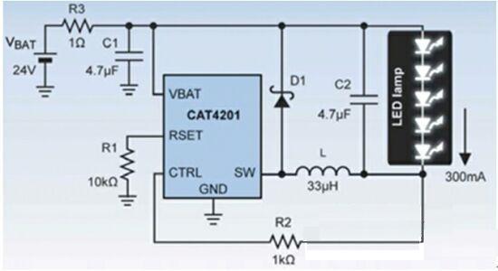 圖2:使用CAT4201驅(qū)動5個1W的LED。