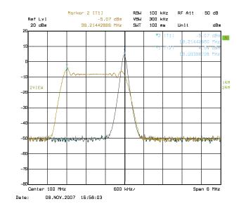 另一種可行解決方案是使用展頻振蕩器(Spread Spectrum Oscillator),來降低系統(tǒng)輻射出來的EMI電磁輻射干擾。圖4則顯示一個單頻信號的頻譜圖以及對該信號展頻后的頻譜圖。從圖中可知展頻后的頻率信號如何降低原來在接近100MHz的峰值。