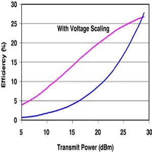 動(dòng)態(tài)/可適性電壓調(diào)整技術(shù)(DVS/AVS)與高整合度組件所使用的方式很類(lèi)似,它會(huì)把閉回路系統(tǒng)中的處理器和穩(wěn)壓器連結(jié)在一起,并在確保系統(tǒng)正常工作的情形下,將數(shù)字電源供應(yīng)的輸出電壓動(dòng)態(tài)調(diào)整至最小值。功率放大器會(huì)被最佳化,使它在最大傳送功率下?lián)碛凶罡咝?。由于絕大多數(shù)手機(jī)都在基地臺(tái)附近工作,手機(jī)的無(wú)線電功能會(huì)在維持通訊質(zhì)量的前題下,將傳送功率降至最低水平。當(dāng)功率放大器在較低的功率水平下工作時(shí),它的效率會(huì)受到影響,從(圖三)可以看出,利用動(dòng)態(tài)電壓調(diào)整技術(shù)來(lái)調(diào)整功率放大器的電壓,它的工作效率會(huì)增加10%至20%。
