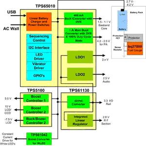 在此解決方案中,3.3VI/O電源是由SEPIC轉(zhuǎn)換器提供,它讓?xiě)?yīng)用系統(tǒng)能充份利用鋰離子電池電力,直到電池電壓降至最低水平(大約2.7V)。和離散解決方案一樣,穩(wěn)壓器輸出也來(lái)自3.3V輸入電源,以便提高工作效率。TPS65010采用48只接腳QFN封裝,這些組件都內(nèi)建FET晶體管。TPS61130SEPIC轉(zhuǎn)換器采用4×4平方厘米QFN封裝,并且內(nèi)建FET晶體管,最高達(dá)到90%以上效率,TPS5100則是三通道輸出控制器,專(zhuān)門(mén)用來(lái)提供電源給顯示器。功率放大器和中央處理器電源使用的動(dòng)態(tài)電壓調(diào)整技術(shù)可以改善每顆零件的效率,進(jìn)而協(xié)助降低功耗。