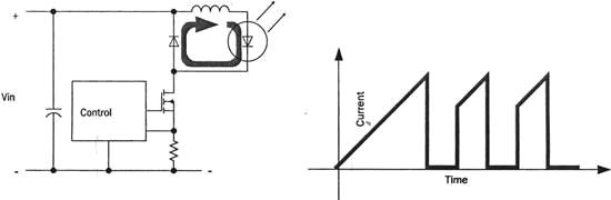 最簡(jiǎn)單的開(kāi)關(guān)穩(wěn)壓器是圖2所示的降壓穩(wěn)壓器,輸入電壓與LED電壓之間的壓差對(duì)電感L充電,電流隨之增加,當(dāng)電流達(dá)到預(yù)設(shè)的值時(shí),控制電路將串聯(lián)的晶體管關(guān)閉,在LED通路形成一個(gè)交變電流。注意,在LED驅(qū)動(dòng)應(yīng)用中,開(kāi)關(guān)穩(wěn)壓電路控制電流的峰值。