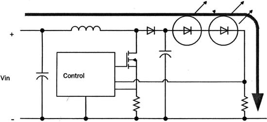 如果電源電壓低于所有LED串聯(lián)電壓和,就要選用升壓穩(wěn)壓器。升壓穩(wěn)壓器(圖3)既要控制電流,又要控制電壓,電路相對(duì)復(fù)雜些。升壓穩(wěn)壓器在大電流情況下同樣存在嚴(yán)重的干擾問(wèn)題。因而最穩(wěn)定又最安全的LED驅(qū)動(dòng)器可采用升壓與降壓相結(jié)合的形式。一個(gè)升壓穩(wěn)壓器可驅(qū)動(dòng)幾個(gè)并聯(lián)的降壓穩(wěn)壓器。這樣,面對(duì)電源的是性能良好的升壓穩(wěn)壓器,而在負(fù)載端則是高電流輸出的降壓穩(wěn)壓器。