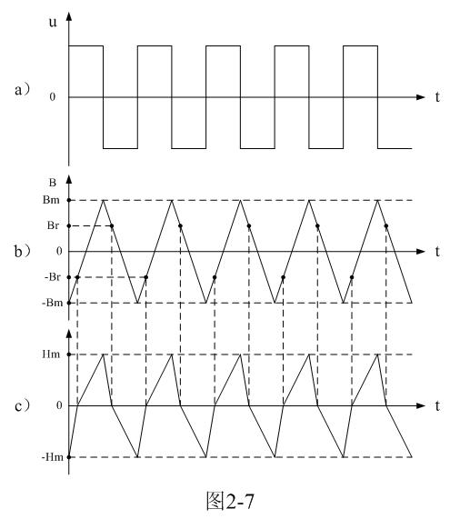 對應(yīng)輸入交流脈沖電壓變化的曲線圖;圖2-7-c為變壓器鐵芯中磁場強度H對應(yīng)磁通密度B或磁通