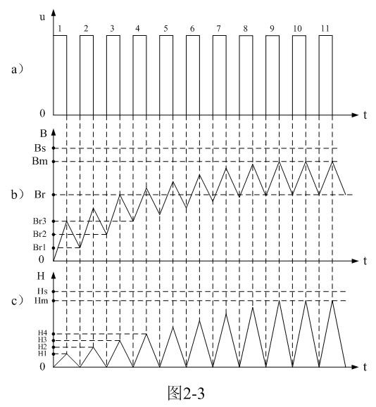 圖2-3是多個直流脈沖電壓連續(xù)加到變壓器初級線圈a、b兩端時,輸入脈沖電壓與變壓器鐵芯中磁通密度B或磁通