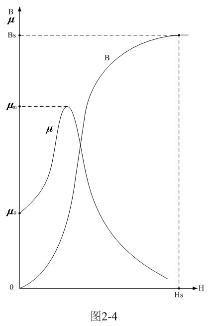 在圖2-4中,曲線B為磁通密度對應(yīng)磁場強度變化的關(guān)系曲線,曲線 為導(dǎo)磁率對應(yīng)磁場強度變化的關(guān)系曲線。由于我們這里把磁場強度作為自變量,而磁通密度和鐵芯導(dǎo)磁率都作為因變量,因此,我們同樣可以把曲線B和曲線 統(tǒng)稱為變壓器鐵芯的磁化曲線。