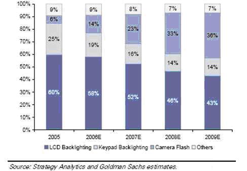 可拍照手機(jī)有取代傳統(tǒng)中低端數(shù)碼相機(jī)的趨勢,并且消費者期望能夠在低光照亮度的條件下拍攝高質(zhì)量的照片,因而采用Flash LED作為閃光燈是提高數(shù)碼相機(jī)性能的重要措施。Flash LED的光學(xué)特性決定它既可以作為拍照的閃光應(yīng)用,也可以用于視頻拍攝時補(bǔ)光,甚至是用于照明的電筒應(yīng)用。因此Flash LED在手機(jī)中的應(yīng)用將會越來越普遍,表1為Flash LED作為閃光燈在手機(jī)LED應(yīng)用中的比例走勢。