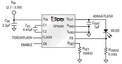 3)SP6686、SP6685和SP7685系列產(chǎn)品可提供300mA至1.2A閃光電流,適用于200萬像素及以上相機(jī)應(yīng)用,圖3為該系列產(chǎn)品的典型應(yīng)用電路: