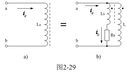 圖2-29-a中,Le是一個同時考慮渦流損耗因素的電感;L是變壓器原初級線圈的電感;Rb是鐵芯渦流損耗電阻;Lb是一個互感線圈,通過它把流過電阻Rb的電流感應(yīng)到變壓器初級線圈中;當(dāng)流過電阻Rb的電流增加時,流過通過Lb互感線圈的感應(yīng)作用,使流過變壓器初級線圈L的電流也同時增加。