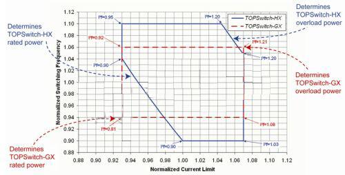 TOPSwitch-HX已解決了上述難題。TOPSwitch-HX引入額外的電路,并在最終測試中采用參數(shù)調整技術,以控制開關頻率與流限值平方的乘積的最大值和最小值,這在數(shù)據(jù)手冊中用一個新的參數(shù)來表征,即功率因數(shù)(I2f)。