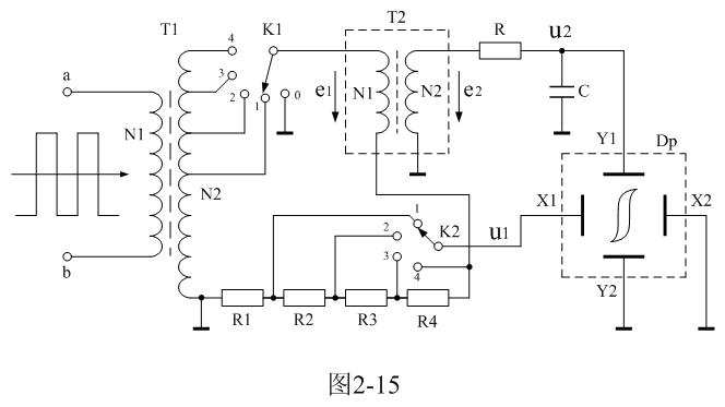 在圖2-15中,變壓器T1為信號源,通過K1選擇變壓器T1次級線圈的抽頭就可以改變信號源的電壓輸出;T2為待測變壓器樣品,Dp為示波器;R1、R2、R3、R4為顯示磁場強(qiáng)度H的取樣電阻,取樣電壓u1作為示波器X軸偏轉(zhuǎn)顯示輸入電壓,通過K2可以選擇取樣電壓輸出,從而可以改變示波器X軸偏轉(zhuǎn)顯示的寬度;電阻R和電容C為積分電路,積分電壓u2由電容C兩端輸出,作為示波器Y軸偏轉(zhuǎn)顯示輸入電壓,以顯示磁通密度B。