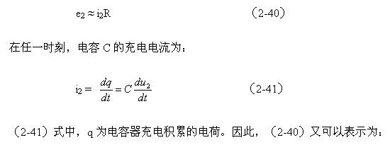 (2-39)式中,i2為流過電阻R的電流,或電容器的充電電流,u2為電容C兩端電壓。與分析變壓器初級線圈中的勵磁電流一樣,如果把積分電路的時間常數(shù)取得足夠大,電阻的阻值也取得足夠大,則在一個周期內(nèi)電容兩端的充電電壓u2相對電阻的電壓降是可以忽略的。則(2-39)式可以改寫為: