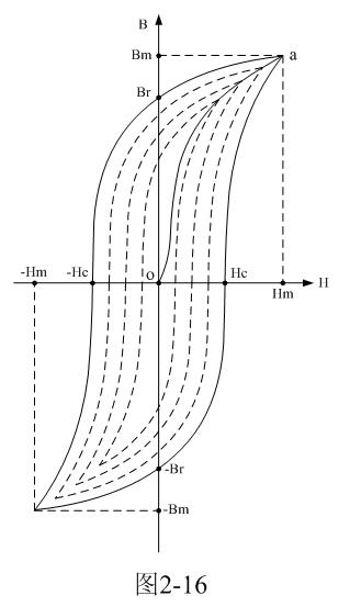 磁矯頑力的大小反映鐵磁材料保持剩磁狀態(tài)的能力。圖2-16表明,當(dāng)磁場按Hm→0→-Hc→-Hm→0→Hc→Hm次序變化時,B所經(jīng)歷的相應(yīng)變化為Bm→Br→0→-Bm→-Br→0→Bm。于是得到一條閉合的B~H曲線,稱為磁滯回線。所以,當(dāng)鐵磁材料處于交變磁場中時(如變壓器中的鐵芯),它將沿磁滯回線反復(fù)被磁化→去磁→反向磁化→反向去磁,這個過程周而復(fù)始。