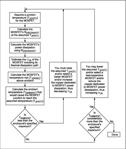 話說回來,TJ又依賴于MOSFET的功率耗散以及MOSFET的熱阻(ΘJA)。這樣,似乎很難找到一個著眼點。由于功率耗散的計算涉及到若干個相互依賴的因素,我們可以采用一種迭代過程獲得我們所需要的結(jié)果(圖1)。