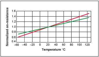 圖2.典型功率MOSFET的導(dǎo)通電阻的溫度系數(shù)在0.35%每度(綠線)至0.5%每度(紅線)之間