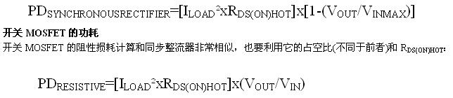 其中,RDS(ON)SPEC是計算所用的MOSFET導(dǎo)通電阻,TSPEC是規(guī)定RDS(ON)SPEC時的溫度。利用計算出的RDS(ON)HOT,可以確定同步整流器和開關(guān)MOSFET的功率消耗,具體做法如下所述。