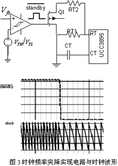 突降實現方法如圖3:以UCC3895為例,當電源處于正常負載狀態(tài)時,Q1導通,其時鐘周期為: