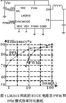 對于額定功率時工作在PWM模式的開關電源,,也可以通過切換至PFM模式提高待機效率,即固定開通時間,調節(jié)關斷時間,負載越低,關斷時間越長,工作頻率也越低。圖5是采用NS公司的LM2618控制的Buck轉換器電路和分別采用PWM和PFM控制方法的效率比較曲線。由圖可見,在輕載時采用PFM模式的電源效率明顯大于采用PWM模式時的效率,且負載越低,PFM效率優(yōu)勢越明顯。