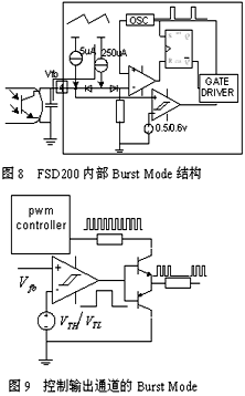 而FSD200則是通過控制內部驅動器實現可控脈沖模式,即將Vfo 腳的反饋電壓與0.6V/0.5V遲滯比較器比較,由比較結果控制門極驅動輸出,其結構可見圖8。我們可根據此原理用分立元件實現普通芯片的BurstMode功能,即檢測次級電壓判斷電源是否處于待機狀態(tài),通過遲滯比較器,控制芯片輸出,電路如圖9所示。