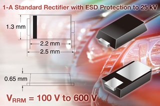 新器件的目標(biāo)應(yīng)用是汽車和工業(yè)控制、傳感器單元,以及照明系統(tǒng)。設(shè)計(jì)者可以根據(jù)所需,從100V(MSE1PB)、200V(MSE1PD)、400V(MSE1PG)和600V(MSE1PJ)中挑選合適的反向電壓等級。所有這些器件都具有1A的平均前向電流和20A的前向浪涌電流。