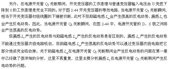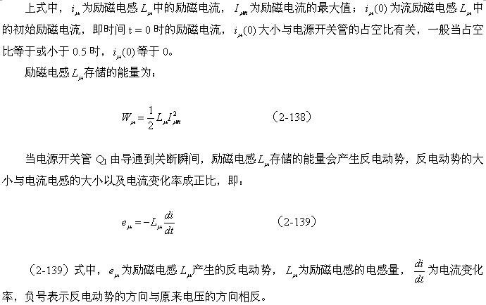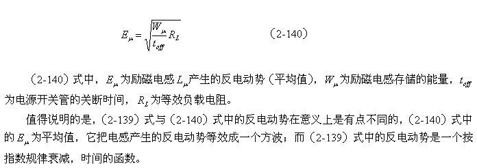 (2-140)式對(duì)于計(jì)算漏感 產(chǎn)生的反電動(dòng)勢(shì)或其它電感產(chǎn)生的反電動(dòng)勢(shì)同樣有效。漏感 中存儲(chǔ)的能量可根據(jù)(2-138)式求得;而流過漏感 的電流,對(duì)于反激式開關(guān)電源:可認(rèn)為與勵(lì)磁電流的大小基本相等,因?yàn)椋诜醇な介_關(guān)電源中,等效負(fù)載電阻等于無限大;對(duì)于正激式開關(guān)電源:可認(rèn)為與流過等效負(fù)載電阻的電流大小基本相等,因?yàn)?,在正激式開關(guān)電源中,勵(lì)磁電流相對(duì)于流過等效負(fù)載電阻的電流,很小。