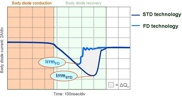 為改善在這些特殊應(yīng)用中體二極管的性能,研發(fā)人員開(kāi)發(fā)出具有快速體二極管恢復(fù)特性MOSFET。當(dāng)二極管導(dǎo)通后被反向偏置,反向恢復(fù)峰值電流Irrm較小,完成恢復(fù)所需要的時(shí)間更短(見(jiàn)圖3)。