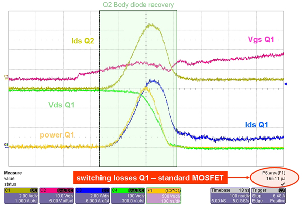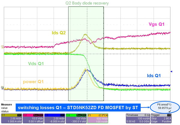 我們對(duì)比測(cè)試了標(biāo)準(zhǔn)的MOSFET和快恢復(fù)MOSFET。ST推出的STD5NK52ZD(SuperFREDmesh系列)放在Q2(LF)中,如圖4b所示。在Q1MOSFET(HF)的導(dǎo)通工作期間,開(kāi)關(guān)損耗降低了65%。采用STD5NK52ZD時(shí)效率和熱性能獲得很大提升(在不采用散熱器的自由流動(dòng)空氣環(huán)境下,殼溫從60°C降低到50°C)。在這種拓?fù)渲?,MOSFET內(nèi)部的體二極管用作續(xù)流二極管,采用具有快速體二極管恢復(fù)特性MOSFET更為合適。