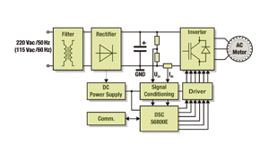 如圖1所示,完整的調(diào)速驅(qū)動系統(tǒng)包括EMI濾波器、輸入整流器、直流供電、DSC(數(shù)字信號控制器)、信號調(diào)理電路,供電變極器,以及門控驅(qū)動器等。