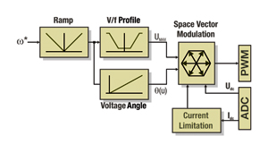 這種簡化方法的最大優(yōu)點就是不需要傳感器,而且控制算法也不需要角速度或電機位置信息。速度是與外部負載的扭矩相關(guān)的,然而,這也是一個最大的缺點,也就是它會降低動態(tài)性能。由于這個原因,標量控制的電動機在負載瞬時變化時,就會輸出遠遠超過需要的扭矩。理論上,使用這種控制方法,能效可能低到50%。