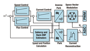 電動機的電流波形是正弦曲線,這可以產(chǎn)生平穩(wěn)的扭矩,而且會減小機械震動和噪聲。外部速度回路調(diào)整供電的定子數(shù)量,這直接與定子電流的積分成比例,并維持所要求的角速度。為了在基本速度之上擴展工作速度的范圍,增加了額外的磁通弱化回路,用于處理定子定向磁通電流。