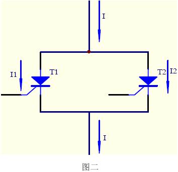 由于單個元件耐壓水平的提高,每個元件并聯(lián)工作以增大設備功率的情形更常見,以兩只晶閘管并聯(lián)工作為例,如圖二所示。