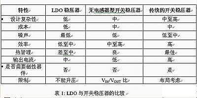 對(duì)于可滿足手機(jī)內(nèi)部電源轉(zhuǎn)換需求的不同電壓穩(wěn)壓器,我們必須認(rèn)真考慮它們的優(yōu)缺點(diǎn)(見(jiàn)表1)。目前有三種選擇:線性LDO穩(wěn)壓器、無(wú)電感型開(kāi)關(guān)穩(wěn)壓器(亦稱為充電泵)以及傳統(tǒng)的開(kāi)關(guān)穩(wěn)壓器(基于電感器)。