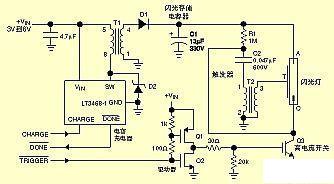 閃光電容器充電器基本上是一種具有某些特殊能力的變壓器耦合升壓轉(zhuǎn)換器。當(dāng)其“充電”控制線為高電位時(shí),穩(wěn)壓器同步內(nèi)部功率開(kāi)關(guān),使升壓變壓器產(chǎn)生高電壓脈沖。然后,這些脈沖再經(jīng)整流和濾波,產(chǎn)生300V的直流輸出,其轉(zhuǎn)換效率高達(dá)80%。