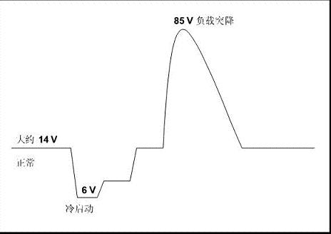 如12V電池電源線的電壓瞬變范圍(VIN)非常寬廣,小至6V,,大至87V。典型的車載電力系統(tǒng)的工作電壓范圍往往只有在9V~16V。引擎關閉時電池的正常額定電壓為12V,啟動時為14.4V。但是,這個范圍在瞬變狀態(tài)時很容易擴大到80V峰值以上。