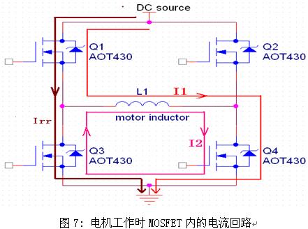 延長MOSFET的開通時(shí)間可以減小開通時(shí)的涌入電流。由于電機(jī)負(fù)載為感性負(fù)載,所以在PWM關(guān)斷時(shí)存在續(xù)流現(xiàn)象(見圖7中的I2),為了減小續(xù)流側(cè)反向恢復(fù)電流(Irr)的大小,PWM側(cè)開關(guān)管的開通速度不宜過快。由于MOSFET處于飽和區(qū)時(shí)有公式:Id=K*(Vgs-Vth)2,(K為一常數(shù),由MOSFET的特性決定)。所以在一定的溫度和Vds條件下,從MOSFET的門極驅(qū)動(dòng)電壓Vgs可以判斷MOSFET中的電流大小。圖5中Vgs峰值為9.1V,圖6中Vgs峰值為6.4V,所以增加電容使得峰值電流減小。Id也可從MOSFET的轉(zhuǎn)移特性圖中獲得。
