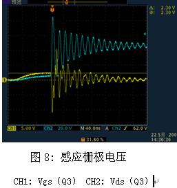 由于MOSFET的封裝電感和線路的雜散電感的存在,在MOSFET反向恢復(fù)電流Irr突然關(guān)斷時(shí),MOSFET(Q3)上的電壓Vds會出現(xiàn)振鈴(如圖8中CH2所示)。此振鈴的出現(xiàn)會導(dǎo)致Vds超過MOSFET的擊穿電壓從而發(fā)生雪崩現(xiàn)象。如果線路中出現(xiàn)振鈴,我們可以通過以下方法來減小振鈴: