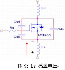 感應(yīng)柵極電壓如圖8中的CH1所示,其值已達(dá)到2.3V。另外,由于源極引線電感的存在,在Q3內(nèi)的電流迅速減小時(shí),會在Ls的兩端感應(yīng)出一個(gè)極性為上負(fù)下正的電壓,如圖9所示,此時(shí)加在DIE上的電壓Vgs(die)要大于在外部引腳上測量的Vgs電壓,所以由于Ls的影響,使得MOSFET有提前導(dǎo)通的可能。如果下管由于感應(yīng)電壓而導(dǎo)通,則會造成上下管穿通,如果MOSFET不能承受此穿通電流,MOSFET就會損壞。