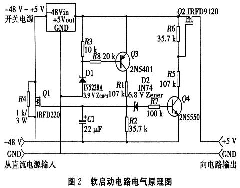 下面采用一個從-48V~+5V的開關(guān)電源路論述“軟啟動”技術(shù)。所用的開關(guān)電源是一個含有LT1172HVCT的穩(wěn)壓器,從負(fù)到正補(bǔ)償提升式(buck-boost)轉(zhuǎn)換器,其實(shí)任何一個從-48V~+5V的開關(guān)電源都能工作。其中,軟啟動電路和開關(guān)電源電路是相互獨(dú)立的,電氣原理如圖2所示。
