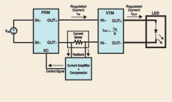 V•I芯片PRM整流器和VTM電壓變換器用來提供穩(wěn)定的電壓。為了使用PRM和VTM給LED供電,需要修改PRM的工作方式以提供穩(wěn)定的電流。這是通過采用電流放大器和補償器來實現(xiàn)的。