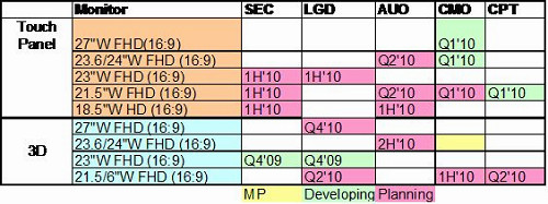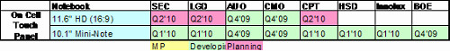 隨著Windows 7推出與對(duì)未來(lái)市場(chǎng)影響力,2010年多數(shù)面板廠商針對(duì)Notebook PC市場(chǎng)積極開(kāi)發(fā)具觸控功能11.6寸寬螢?zāi)幻姘澹瑫r(shí)每一家生產(chǎn)迷你筆電面板廠商也都開(kāi)發(fā)具有觸控功能面板。從下表一可以清楚了解每一廠商開(kāi)發(fā)具觸控功能Notebook PC或迷你筆電面板時(shí)間表。