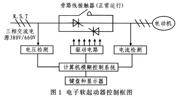 軟起動有磁控降壓軟起動器和電子軟起動器。其中,磁控降壓軟起動采用控磁限幅調壓方式減壓調控電動機起動時的電壓,實質就是電抗器降壓起動。電子軟起動器有晶閘管調壓軟起動和變頻器調速軟起動。晶閘管調壓軟起動器的主回路采用6只晶閘管兩兩反向并聯(lián)組成的調壓電路,并焊接于電動機的三相供電線路。當起動器的微機控制系統(tǒng)接收到起動指令后進行有關計算。輸出晶閘管的觸發(fā)信號,通過控制晶閘管的導通角起動器按所設定的模式調節(jié)輸出電壓,從而控制電動機的起動。當電動機起動完成后,起動器吸合旁路線接觸器,使晶閘管短路,電動機直接投入電網(wǎng)運行,避免不必要的電能損耗。圖1為電子軟起動器控制框圖。