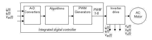 圖 1 是通用數(shù)字馬達控制系統(tǒng)的結(jié)構(gòu)簡圖。算法可在數(shù)字控制器上實施,數(shù)字控制器生成的控制輸出可通過逆變器驅(qū)動馬達。電流及電壓測量等反饋信號通過模數(shù)轉(zhuǎn)換器 (ADC) 反饋至該算法。