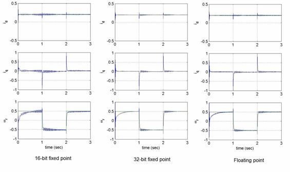 要比較三種數(shù)據(jù)格式對數(shù)值精度的影響,需要監(jiān)控估計速度響應(yīng)與相應(yīng)的d 及q 軸參考電流。將所有的PI 增益、參數(shù)、基本量在全部三種數(shù)據(jù)格式的仿真過程中設(shè)定為相同的有效值。從圖4 可以看出,16位定點版本與浮點版本的性能具有極大的差別。