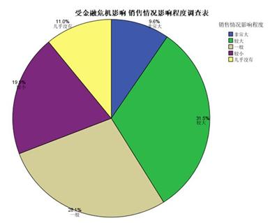 受金融危機(jī)的影響,銷售情況影響程度非常大的公司比重占9.6%,影響較大的為31.5%,幾乎沒有影響的只有11.0%(如下圖:受金融危機(jī)影響銷售情況影響程度調(diào)查表)。