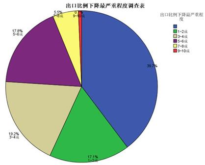 金融風(fēng)暴,全球經(jīng)濟(jì)重創(chuàng),對(duì)出口為主的企業(yè)影響最為慘重,尤其是對(duì)于以出口為導(dǎo)向的我國行業(yè)企業(yè),損失慘重。數(shù)據(jù)顯示,受金融危機(jī)影響,出口比例下降最嚴(yán)重程度5-6成者比重最大,占17.8%,下降1-2成者比例也不低,占17.1%(如下圖:出口比例下降最嚴(yán)重程度調(diào)查表。備注:藍(lán)色部分39.7%比例為單一內(nèi)銷型企業(yè))。