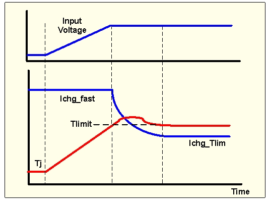 為解決此類散熱問題,可添加一個散熱環(huán)路,以降低充電電流并確保IC結點溫度低于熱關斷閾值。為bq2406X系列線性充電器添加了散熱環(huán)路的運行如圖2所示。散熱環(huán)路在激活狀態(tài)下可有效降低充電電流,降低充電器級功率MOSFET的功耗。