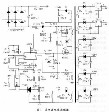 +15V電源和-15V電源對控制電路電源精度要求較高,但因為共用同一個變壓器很難通過PWM實現(xiàn)反饋控制來穩(wěn)壓。為獲得高品質(zhì)的控制電源,應(yīng)用線性穩(wěn)壓芯片7815和7915(如圖1所示)構(gòu)成了復(fù)合式開關(guān)穩(wěn)壓電源。為防止輸出在輕載或空載時的電壓升高,在5 V整流輸出端并聯(lián)一個100Ω的負載電阻。
