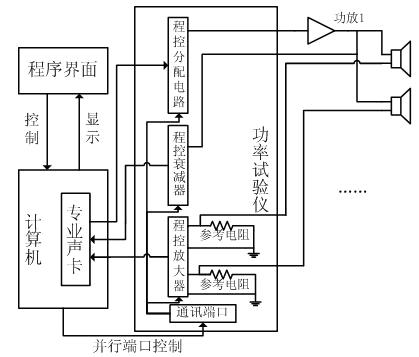常見的專業(yè)聲卡一般只具備兩個輸入通道,兩個輸出通道,而功率試驗要求能夠同時對多個通道進行測試,故需要分配電路實現(xiàn)信號選擇;此外,專業(yè)聲卡的電壓工作范圍在1至2伏之間,揚聲器的實際工作電壓和工作電流有較大的變化范圍,因此需要進行電平變換才能和聲卡連接。綜合這些因素,需要一套獨立的功率試驗儀和聲卡相配合,才能完成測試功能。功率試驗儀內(nèi)部由程控分配電路、程控衰減器、程控放大器、通訊端口、電源電路和接線端子等部分組成。整個硬件平臺結(jié)構(gòu)如圖1所示。